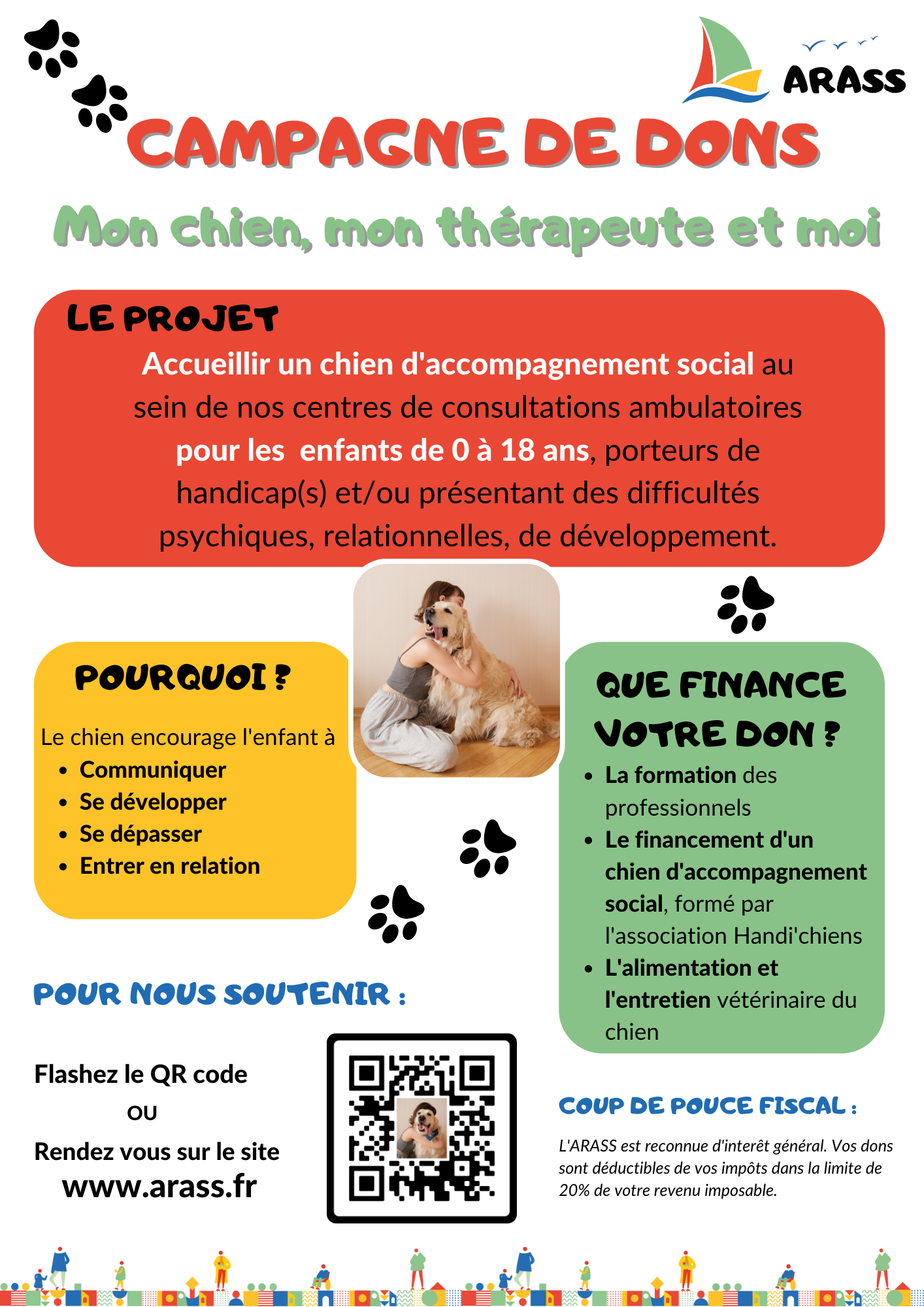 Ce projet a pour but d’accueillir un chien d’accompagnement social dans une optique de soins ou de rééducation afin de faciliter le développement, la socialisation, et l’inclusion de l’enfant en situation de handicap grâce à la médiation animale.